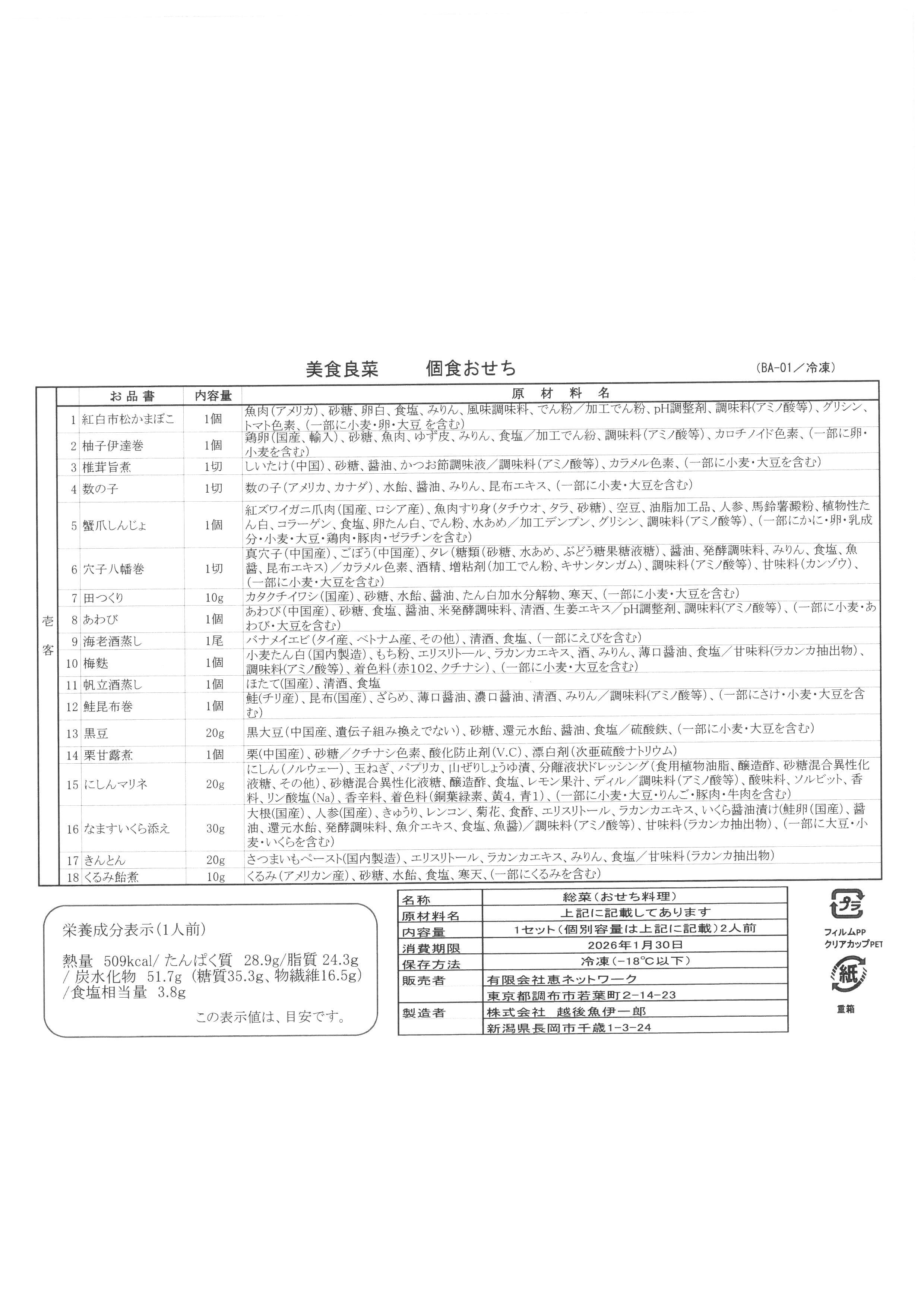 紅白市松かまぼこ、柚子伊達巻、椎茸旨煮、数の子、蟹爪しんじょ、穴子八幡巻き、田つくり、あわび、海老酒蒸し、梅麩、帆立酒蒸し、鮭昆布巻き、黒豆、栗甘露煮、にしんマリネ、なますいくら添え、きんとん、胡桃飴煮